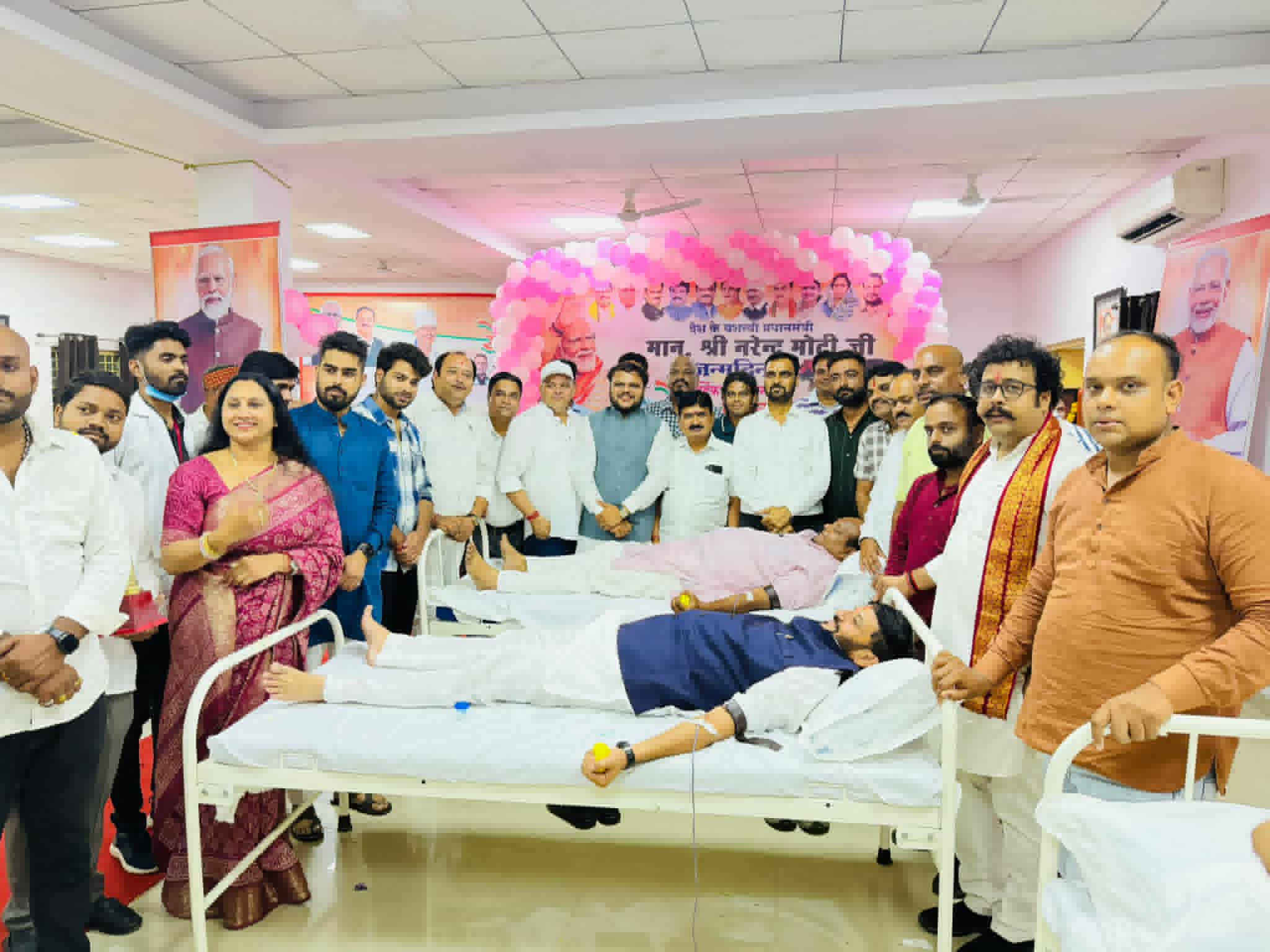 सागर। प्रधानमंत्री श्री नरेंद्र मोदी जीके जन्मदिन के अवसर भारतीय जनता पार्टी द्वारा आयोजित सेवा पखवाड़ा का शुभारंभ संगठनात्मक सागर जिले में रक्त दान शिविर के साथ हुआ। धर्म श्री स्थित संभागीय भाजपा कार्यालय में आयोजित रक्त शिविर का शुभारंभ कैबिनेट मंत्री गोविंद सिंह,जिला अध्यक्ष श्याम तिवारी,विधायक शैलेंद्र कुमार जैन प्रदेश मंत्री प्रभु दयाल,महापौर संगीता तिवारी नगर निगम अध्यक्ष वृंदावन अहिरवार सेवा पखवाड़ा टोली जिला संयोजक जगन्नाथ गुरैया,पूर्व सांसद राजबहादुर सिंह,पूर्व विधायक सुधा जैन,बुद्धि जीवी प्रकोष्ठ के प्रदेश संयोजक अनुराग प्यासी जिला पंचायत सदस्य सर्वजीत सिंह ने पं.दीनदयाल उपाध्याय एवं श्यामा प्रसाद मुखर्जी के चित्र के समक्ष दीप प्रज्वलित एवं माल्यार्पण कर किया। भाजपा कार्यालय के स्व. राजा दुबे सभागार में अतिथियों द्वारा केक काटकर व एक दूसरे को मिष्ठान खिलाकर प्रधानमंत्री श्री नरेंद्र मोदी जी के जन्मदिन की शुभकामनाएँ दी गई। नेता गणों ने रक्तदान शिविर का अवलोकन कर रक्त दाताओं का उत्साहवर्धन किया। रक्तदान शिविर में जिला अध्यक्ष श्याम तिवारी जी के साथ स्व प्रेरणा से 135 पार्टी कार्यकर्ताओं व युवाओं ने रक्त दान कर डिजिटल तकनीक से प्रमाण पत्र प्राप्त किए। रक्तदान शिविर में चैतन्य ब्लड सेंटर के संचालक संजय सिंह,संगीता सिंह डॉ.जितेंद्र पटेल,डॉ.कपिल साहू के साथ लगभग 15 सदस्यों की टीम उपस्थित रहीं जो रक्तदान के पूर्व रक्तदाताओं का वजन,ब्लड प्रेशर सहित आवश्यक जांचों में सेवा प्रदान की। वातानुकूलित परिसर में आयोजित रक्त दान शिविर में 10 वेड की व्यवस्था की गई थी। रक्तदाताओं के लिए मौसम के अनुकूल पेय व खाद्य पदार्थ भेंट की व्यवस्था की गई थी। जिला मीडिया प्रभारी श्रीकांत जैन ने बताया कि प्रधानमंत्री श्री नरेंद्र मोदी के जन्मदिन के अवसर पर संभागीय भाजपा कार्यालय में रंग बिरंगे गुब्बारों से जन्मदिन की थीम पर विशेष रूप सजाया गया। परिसर में महिला मोर्चा की बहिनों द्वारा मनभावन रंगोली सजाई गई। जिला अध्यक्ष श्याम तिवारी ने सभी रक्त दाताओं एवं सहयोगियों का आभार व्यक्त किया। कार्यक्रम प्रभारी यश अग्रवाल ने बताया रक्तदान शिविर में पार्षद रीतेश तिवारी कार्यालय मंत्री देवेन्द्र कटारे,जिला सह मीडिया प्रभारी आलोक केशरवानी,नितिन सोनी, राहुल वैद्य राहुल खटीक,नवनीत सिंह,अर्पित ठाकुर,मनोज रैकवार, अभिमन्यु सोनी,लखन ठाकुर,नेहा जैन,श्वेता तिवारी,रूप राज,प्रीति केसरवानी कविता लारिया, राम सिंह अहिरवार,राजेश अग्रवाल,कमल सोनी,अर्पित जैन,सौरभ वर्मा, रोहित अहिरवार, अनीता अहिरवार,रामकुमार सेन,आकाश लोधी,भूपेंद्र सिंह,सोनू,तारिक़ उस्मानी, साहिल,राजाराम पटेल,अमन ग